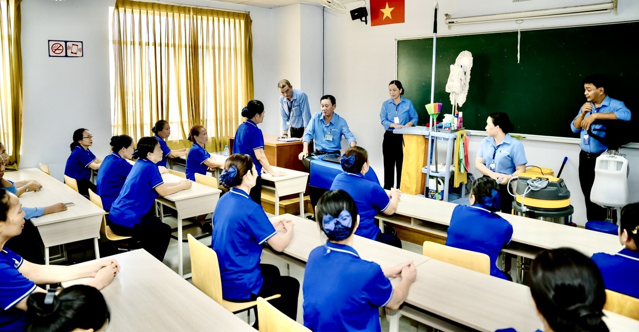 Nghiệp Vụ: Toàn bộ nhân viên tạp vụ cung cấp cho quý khách hàng đều được học kỹ lưỡng về quy trình vệ sinh. (Lau sàn, lau kính, khử mùi, vệ sinh bàn làm việc, vệ sinh toilets … ), phương pháp sử dụng máy chà sàn, máy hút nước … Cách pha chế hóa chất sử dụng phù hợp với tính chất của từng loại sàn.